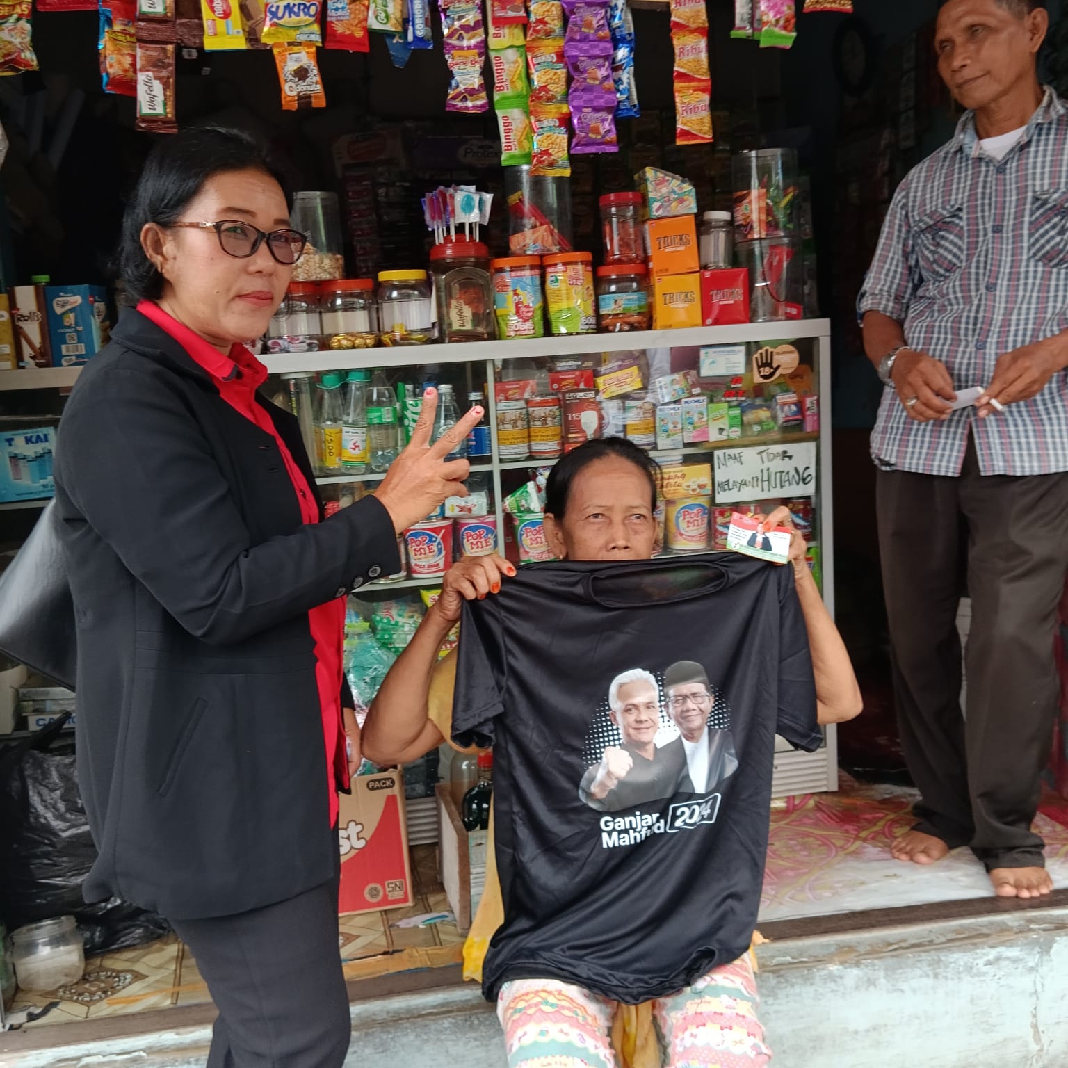 Ia tampak dikawal Bawaslu dan Bhabinkamtibnas Kepolisian, TNI saat membagikan Alat Peraga Kampanye (APK) berupa Kartu Nama, Kalender dan Baju kaos bergambar Capres-Cawapres Ganjar – Mahfud.