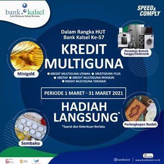 “Sekali lagi, program ini hanya berlaku sampai dengan akhir Maret, jadi bagi nasabah existing maupun masyarakat yang tidak ingin melewatkan kesempatan hadiah langsung ini, segera ajukan kredit multiguna Bank Kalsel sekarang!” pungkas Agus. adv/afd