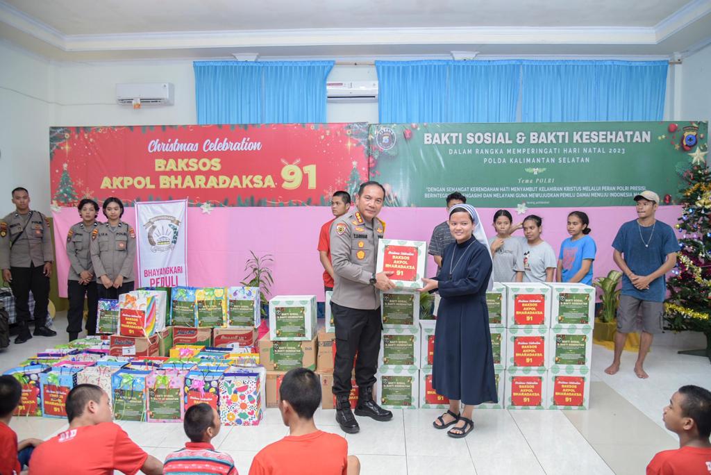 Hosana 91 dan Oikoumene Polda Kalsel bergotong-royong menyalurkan 100 paket sembako, 200 bingkisan Natal, 50 Koli perlengkapan panti, 200 mainan edukasi, serta bantuan pemeriksaan kesehatan dan obat-obatan.