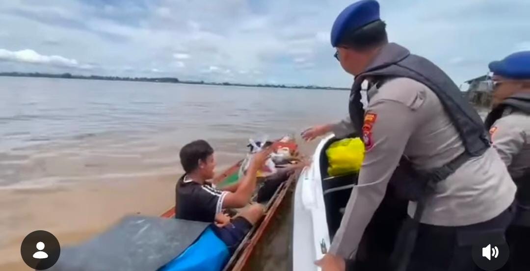 Dengan menggunakan kapal patroli, personel berseragam biru itu menyusuri perairan dan membagikan bantuan secara langsung kepada warga pesisir sungai.