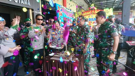 Tentu saja mereka membawa kue ulang tahun. Setelah Kapolresta Banjarmasim Kombes Pol Sabama Atmojo Martosumito selesai memimpin apel, mereka langsung dupersilakan makan sambil bincang-bincang santai