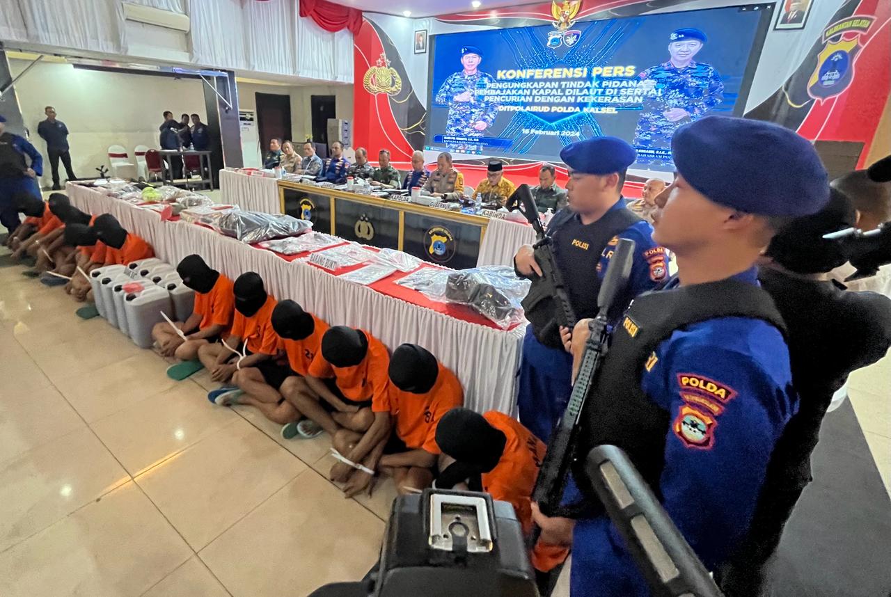 Kapolda Kalsel Irjen Pol Winarto menyampaikan, bahwa pembajakan kapal baru pertama kali terjadi di Provinsi Kalsel”Petugas berhasil mengamankan 13 orang pelaku termasuk penadah minyak hasil rompak, dan 3 orang pelaku lainnya masih buron, akibat kejadian tersebut korban mengalami kerugian sekitar 8 miliar lebih,” katanya, saat menggelar Press Release bersama jajaran Forkompinda Kalsel, di Aula Mathilda Batyaleri Jum’at (16/2/2024).