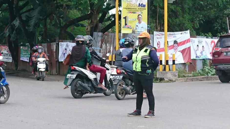 Banjarmasin, BARITO – Menjadi sukarelawan Pengatur Lalu Lintas (Supeltas) di simpang empat Jalan Sungai Andai-Sultan Adam Banjarmasin Utara yang dilakoni Norsyariah (46) dengan mengutamakan Protokol Kesehatan (Prokes), Senin (16/11/2020). Bagaimana tidak teriknya panas matahari, tetap membuatnya semangat meski ditengah pandemi virus Corona.