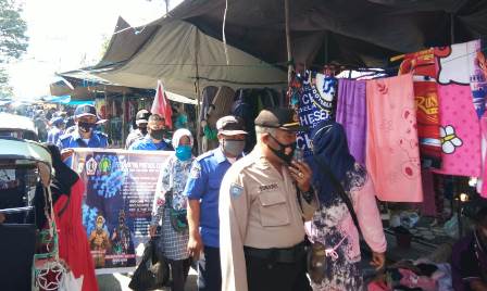 Sat Binmas Polres Batola Kel Marabahan Kota Kecamatan Marabahan Kab Batola Upaya penerapan dalam percepatan penanganan protokol Covid-19 di Kab. Barito Kuala terus dilakukan Sat Binmas Polres Batola dengan melaksanakan kegiatan penerapan Peraturan Bupati Batola No 54 Tahun 2020 tentang peraturan pendisiplinan dalam rangka percepatan penanganan Corona Virus Disease 2019 (Covid 19) kepada warga masyarakat di Pasar Selasa Kel Marabahan Kota Kecamatan Marabahan Kab. Barito Kuala, Selasa (18/8/2020).