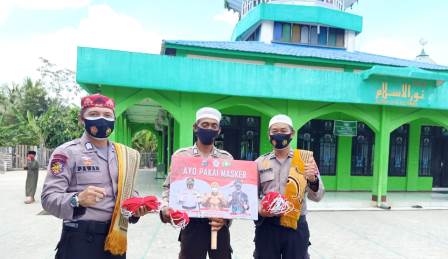 Sat Polairud Batola lakukan kegiatan pembagian masker dan Gerakan Ayo Pakai Masker kegiatan gerakan menuju adaptasi kebiasaan baru masyarakat di Kab. Batola dengan mentaati protokol kesehatan. Sat Polairud Polres Batola melaksanakan sosialisasi protokol kesehatan dan pembagian masker sebanyak 200 masker kepada masyarakat/jamaah sholat Jumat Mesjid Nurul Islam Desa Jelapat 1 Kec Tamban dan masyarakat perairan Sungai Barito serta masyarakat sekitar agar selalu menggunakan Masker, Sabtu (19/9/2020).