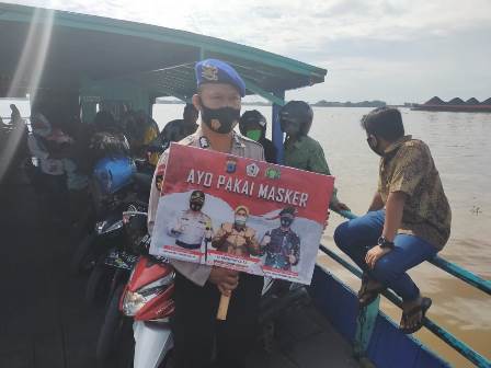 Sat Polairud Polres Batola Polda Kalsel Kalsel lakukan Kegiatan Gerakan Ayo Pakai Masker di Pesisir perairan Sungai Barito Kab Batola, Minggu (27/9/2020).