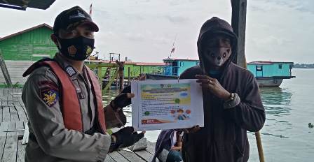 Sat Polairud Polres Batola lakukan Kegiatan Sosialisasi Peraturan Bupati Batola No 54 Tahun 2020 Tentang Pedoman Pelaksanaan Pembatasan Kegiatan Masyarakat Dalam Rangka Percepatan Penanganan Corona Virus Disease 2019 (Covid 19), Sabtu (15/8/2020).