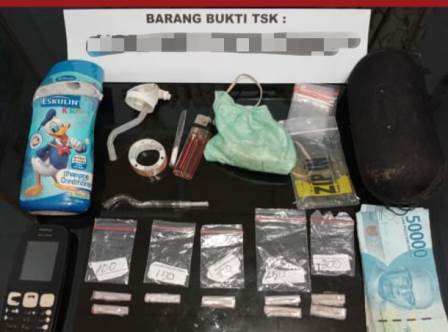 1 (satu) buah pipet yang terbuat dari kaca warna bening yang diduga masih ada sisa sabu-sabu, 1 (satu) buah tutup bong warna putih, 1 (satu) buah korek api gas warna merah, 1 (satu) buah serok yang terbuat dari sedotan plastik warna bening, 1 (satu) lembar plastik klip ukuran agak besar merk Zip In, 10 (sepuluh) lembar plastik klip warna bening, 1 (satu) buah selotip merk Berry warna bening, 1 (satu) buah masker warna hijau, 1 (satu) buah botol bekas shampoo merk Eskulin warna biru, 1 (satu) buah wadah bekas kacamata warna hitam, 1 (satu) buah handphone merk Nokia warna hitam, Uang tunai sebesar Rp. 400.000,- (empat ratus ribu rupiah). Selanjutnya Pelaku dan Barang Bukti diamankan di Polres HST untuk proses lebih lanjut.