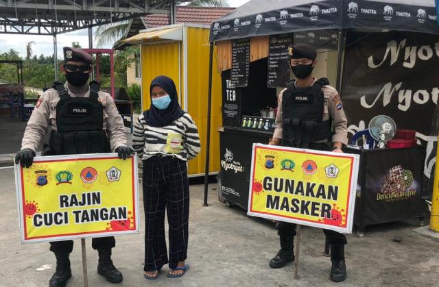 Tergelarnya Personil Polri berseragam ditempat rawan penyebaran Covid 19 dengan mengajak masyarakat selalu memperhatikan protokol kesehatan guna menekan angka penyebaran Covid-19.