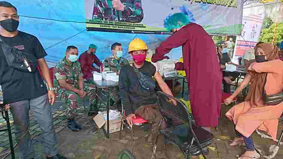 Banjarmasin, BARITO – Vaksinasi yang digelar PT Dutabahari Menara Line (DML) Dockyard dan Kodim 1007/Bjm benar-benar dimanfaatkan oleh pekerja setempat, Rabu (1/12/2021). Dock Repair tongkang yang terletak di bantaran Sungai Barito atau Jalan Ir PHM Noor Kelurahan Banjarmasin Barat itu didatangi Amin (40).