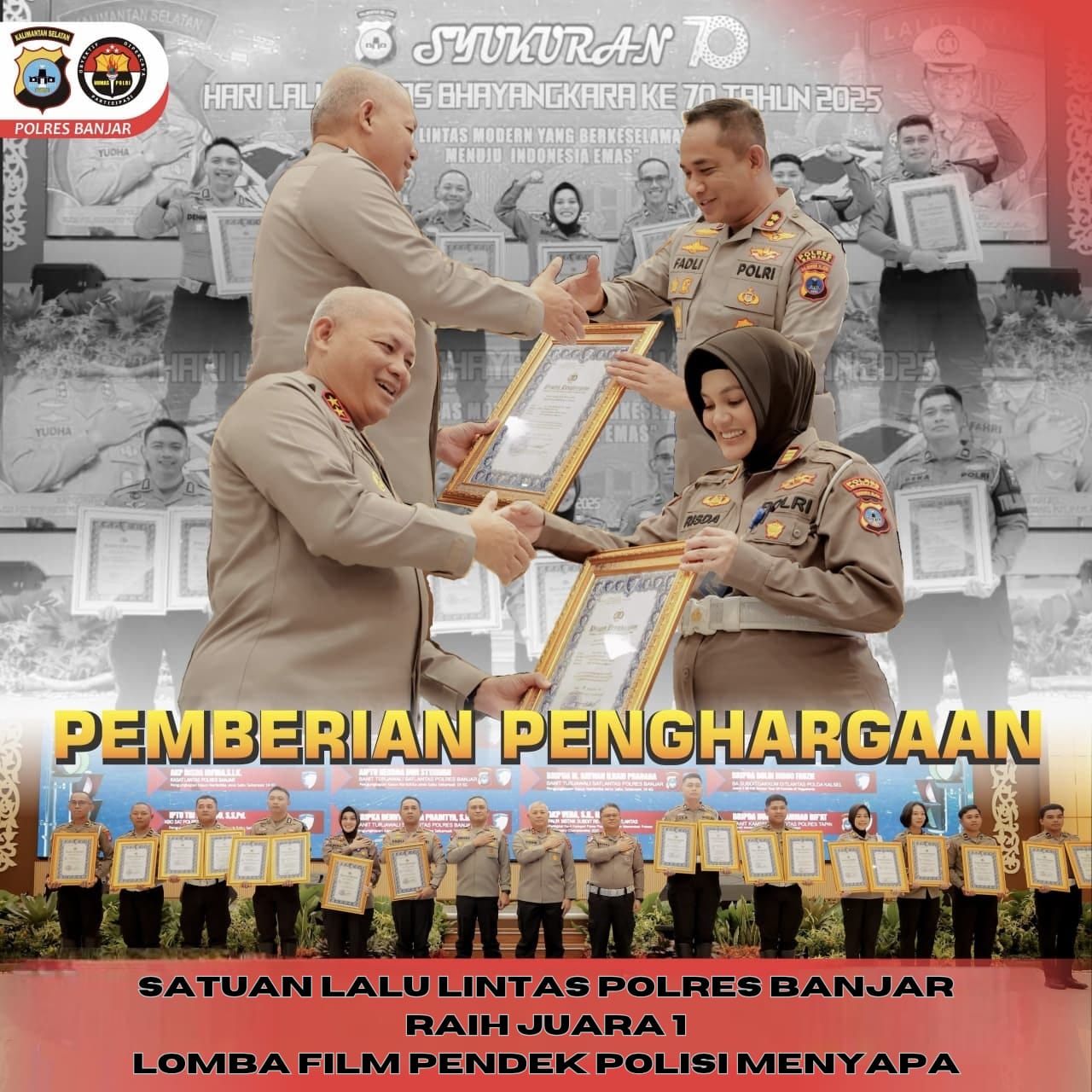 Martapura, BARITOPOST.CO.ID – Dalam rangkaian syukuran HUT ke-70 Lalu Lintas Bhayangkara, Satlantas Polres Banjar berhasil meraih Juara I Lomba Film Pendek “Polisi Menyapa”. Penghargaan diserahkan langsung oleh Kapolda Kalsel Irjen Pol Rosyanto Yudha Hermawan di Auditorium Mapolda Kalsel, Banjarbaru, Senin (22/9).
