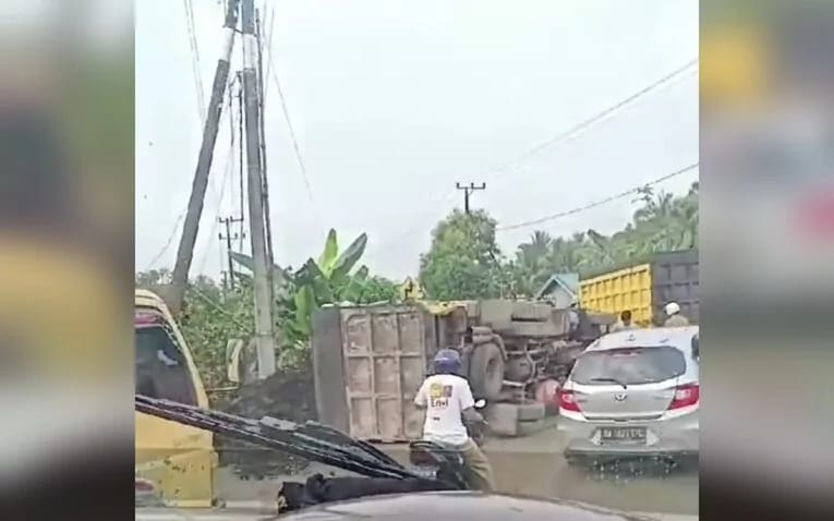 Truck yang terguling itu menumpahkan muatan batu bara di jalan raya, sehingga menyebabkan kemacetan di jalan tersebut.