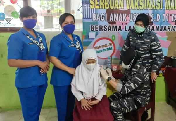 Serbuan Vaksinasi Maritim kali ini menyasar anak-anak sekolah usia 6 sampai 12 tahun, di SDN Kebun Bunga 1, Kecamatan Banjarmasin Timur, Kota Banjarmasin, Rabu (26/1/2022).