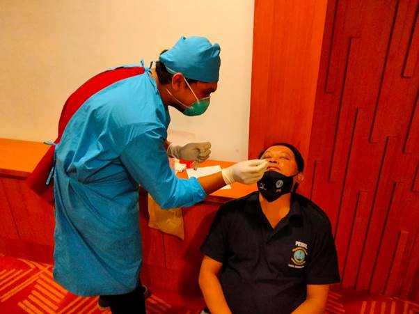 Setelah mendaftar dan menujukkan Kartu Tanda Penduduk (KTP), seorang petugas pun melakukan tugasnya agar kesehatan wartawan dijamin dengan Antigen tersebut.