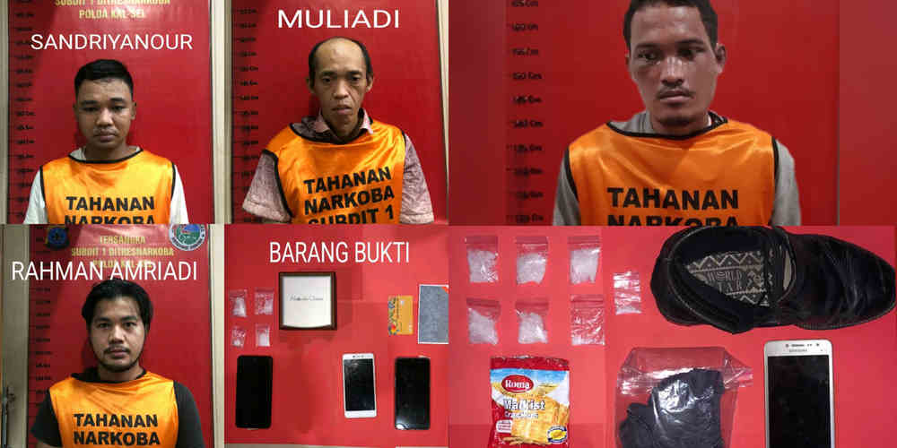 Sandriyanor tak berkutik saat anggota Subdit 1 berhasil menemukan 4 (empat) paket shabu dengan berat kotor 7,75 gram (bersih 6,87 gram) saat dilakukan penggeledahan di kediamannya Jalan Mahligai Bulan Kelurahan Sinar bulan Kecamatan Satui Kabupaten Tanah Bumbu Provinsi Kalsel, Kamis (23/7/2020) sekitar pukul 14.00 WITA. Hasil pengembangan, Sandriannor mengaku barang bukti sabu didapatkan dari Muliadi (42) dan Rahman Amriadi (20) . Tanpa buang waktu anggota Subdit 1 yang dikomando Kasubdit1 AKBP Matsari atas perintah Direktur Ditresnarkoba Polda Kalsel berhasil menyergap kedua warga Kelayan B Gg. Gembira Rt/Rw : 015/002 Kelurahan Kelayan Tengah Kecamatan Banjarmasin Selatan Kota Banjarmasin itu di Tepi Jalan Yos Sudarso Kelurahan Telaga Biru Kecamatan Banjarmasin Barat Kota Banjarmasin . Dari keduanya polisi menyita dua ponsel dan 1 buku tabungan serta ATM yang diduga digunakan untuk traksaksi sabu