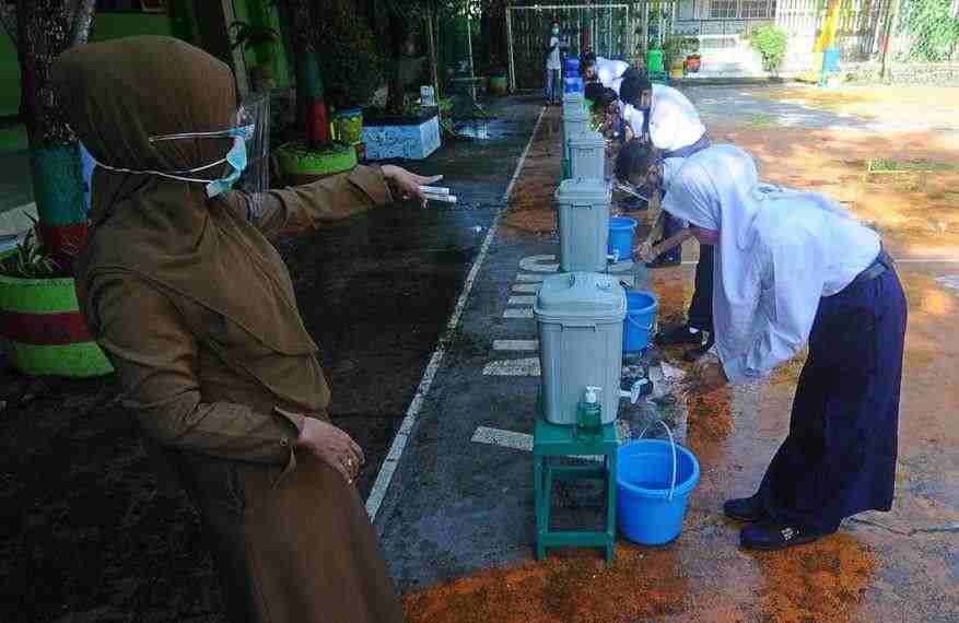 Jam masuk tidak serentak. Agar tak ada penumpukan. Waktu belajar empat jam. Satu kali istirahat dan kantin tidak dibuka. Jadi siswa harus bawa bekal masing-masing.