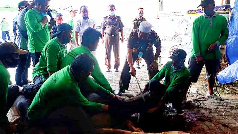 Banjarmasin, BARITO – Dihari ketiga lebaran Idul Adha 1441 H, Senin (3/8 ) Kejaksaan Tinggi Kalsel melaksanakan pemotongan hewan qurban. Ada sebanyak 9 ekor sapi yang disembelih oleh panitia. Salah satunya pemotongan dilakukan Kepala Kejaksaan Tinggi (Kajati) Kalsel Arie Arifin SH MH yang diwakili salah satu ahli penyembelihan qurban.