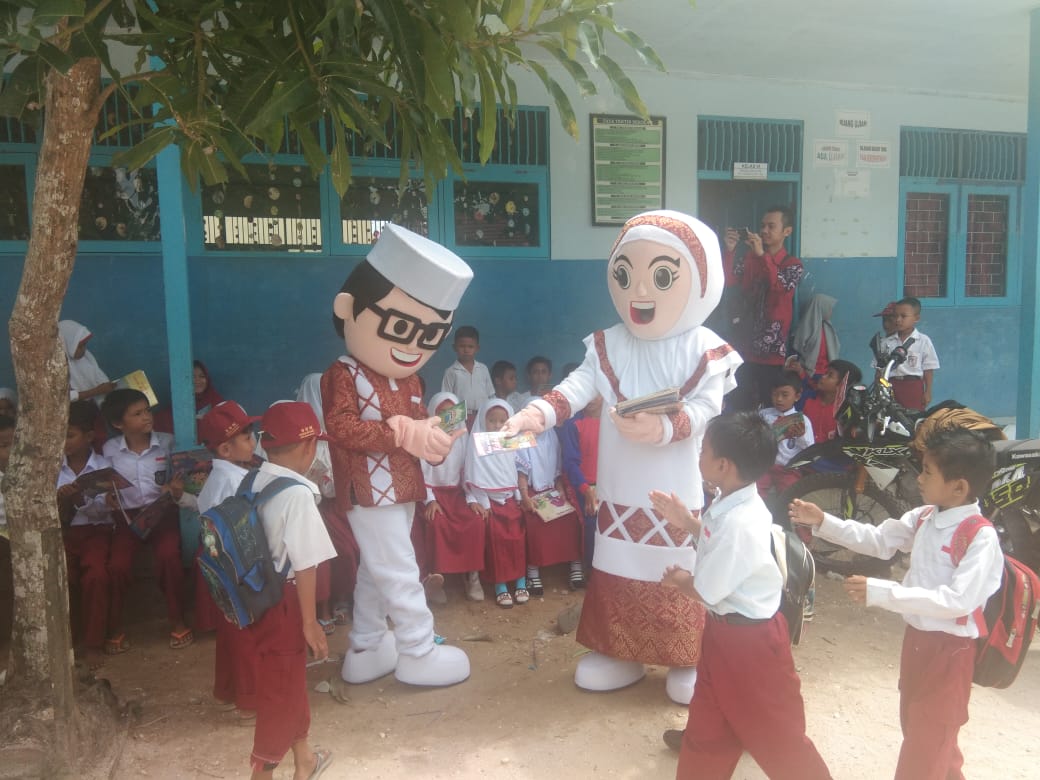 Banjarmasin, BARITO – Seluruh siswa/siswi SDN 9 Banua Anyar Banjarmasin, Rabu pagi (2/10) berhamburan ke halaman sekolah mereka saat melihat pasangan badut Soleh dan Solehan tiba bersama rombongan pustakawan dari Perpustakaan Palnam yang membawa buku-buku dengan sepeda motor trail.