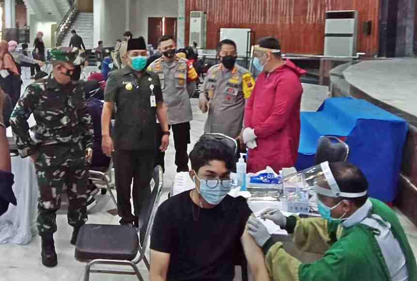 Seorang mahasiswa Universitas Lambung Mangkurat, disaksikan Pejabat Utama Polda Kalsel disuntik vaksin covid 19, di Gedung Sultan Suriansyah, Banjarmasin, Senin (21/6/2021). (Foto : iman satria/brt)