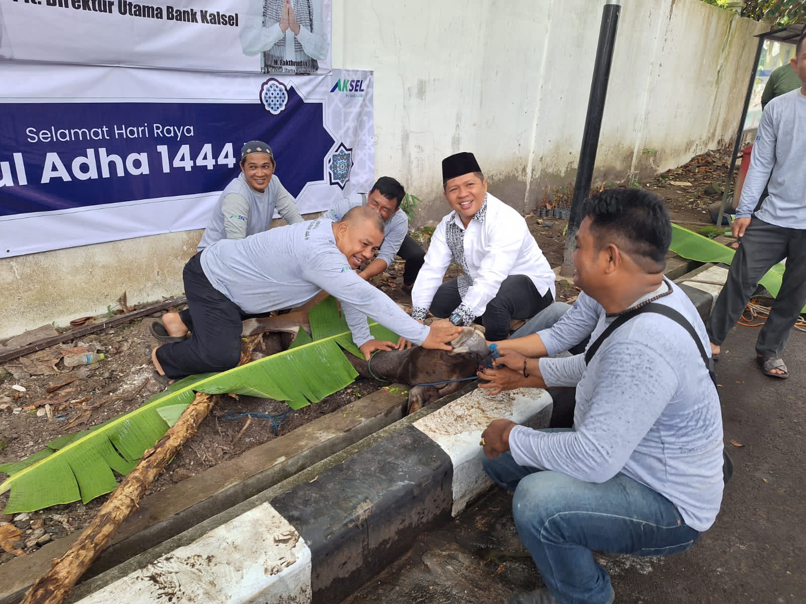 Disampaikannya 2 ekor sapi qurban itu bantuan dari Bank Kalsel dengan dukungan dari Ketua DPRD Provinsi Kalsel, DR (HC) H Supian HK, SH, MH.