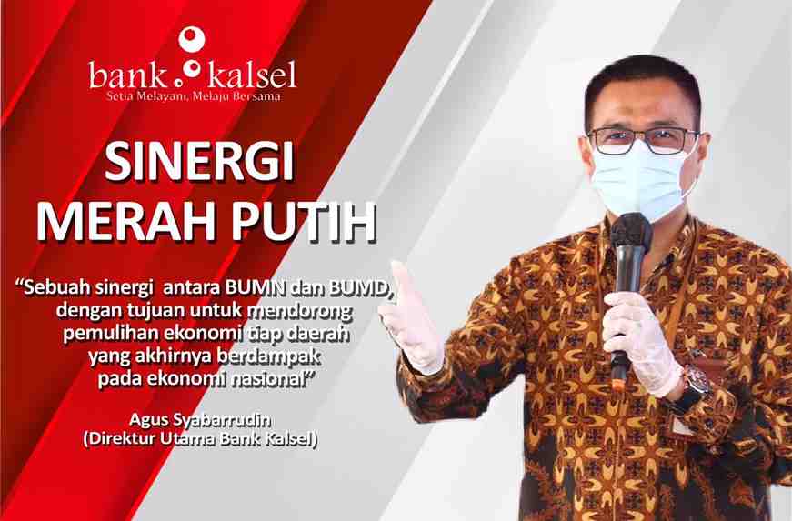 Direktur Utama Bank Kalsel, Agus Syabarrudin, menilai dan menggarisbawahi pentingnya peranan semua pihak untuk mengoptimalkan setiap potensi yang dimiliki dalam upaya memulihkan ekonomi nasional. Bersama dengan Bank Kalsel, beliau menggerakkan sinergi ‘Merah – Putih’, sebagai bentuk inisiatif mendukung pemulihan ekonomi nasional. “Sinergi ‘Merah – Putih’ adalah sebuah sinergi antara BUMN dengan BUMD, dalam hal ini dimulai oleh Bank Kalsel, dengan tujuan untuk mendorong pemulihan ekonomi tiap daerah yang akhirnya berdampak pada ekonomi nasional. Bank Kalsel telah mulai bersilaturahmi dengan Perum PPD, PT Taspen (Persero), PT. Krakatau Steel (Persero), dan PT Pos Indonesia (Persero),” tutur Agus.