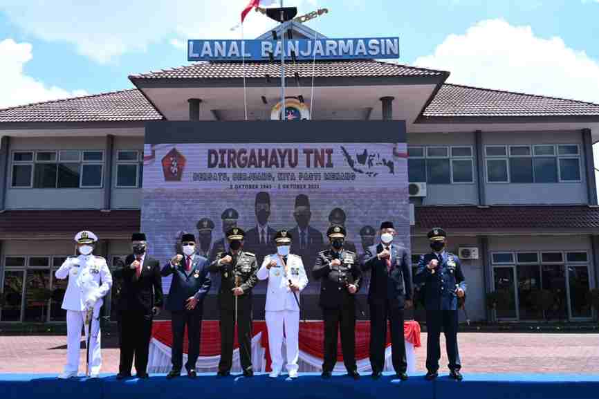 Banjarmasin, BARITO – Kapolda Kalimantan Selatan Irjen Pol Drs. Rikwanto, mengikuti kegiatan Upacara Peringatan Hari Ulang Tahun (HUT) Tentara Republik Indonesia (TNI) Ke-76 Tahun 2021 di Mako Lanal Banjarmasin, Selasa (5/10/2021) pukul 08.45 Wita.