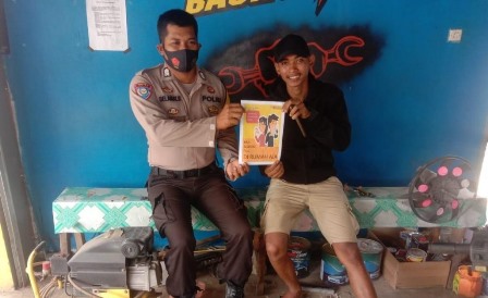 Bripka Selamat Riyanto memberikan, himbauan sosialisasi tentang jaga jarak aman 1-2 meter, melakukan social distancing, penggunaan masker, selalu menjaga kebersihan dan cuci tangan dengan sabun sanitizer, tidak bersentuhan dengan orang lain, dan tidak berkumpul.