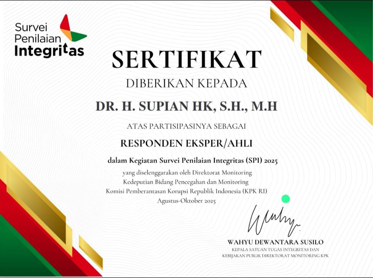 Inilah sertifikat yang diterima Ketua DPRD Provinsi Kalsel Dr (HC) H Supian HK, SH, MH dari KPK RI sebagai responden ahli saat Survei Penilaian Integritas (SPI) Tahun 2025.(foto : ist)