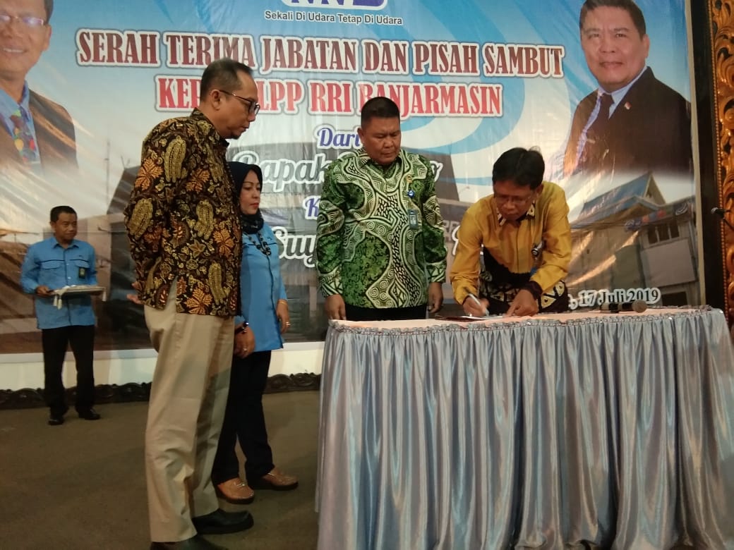 Banjarmasin, BARITO – Kepala LPP RRI Banjarmasin melakukan prosesi serah terima jabatan dari Ngatno kepada Suyono Wasis SH MM, Selasa (17/07) di Banjarmasin. Acara yang dihadiri Ass III Setdaprov Kalsel Heriansyah dan Direktur Program dan Produksi RRI Sulaiman Yusuf itu dipandu dengan kesenian madihin oleh Anang Syahrani.