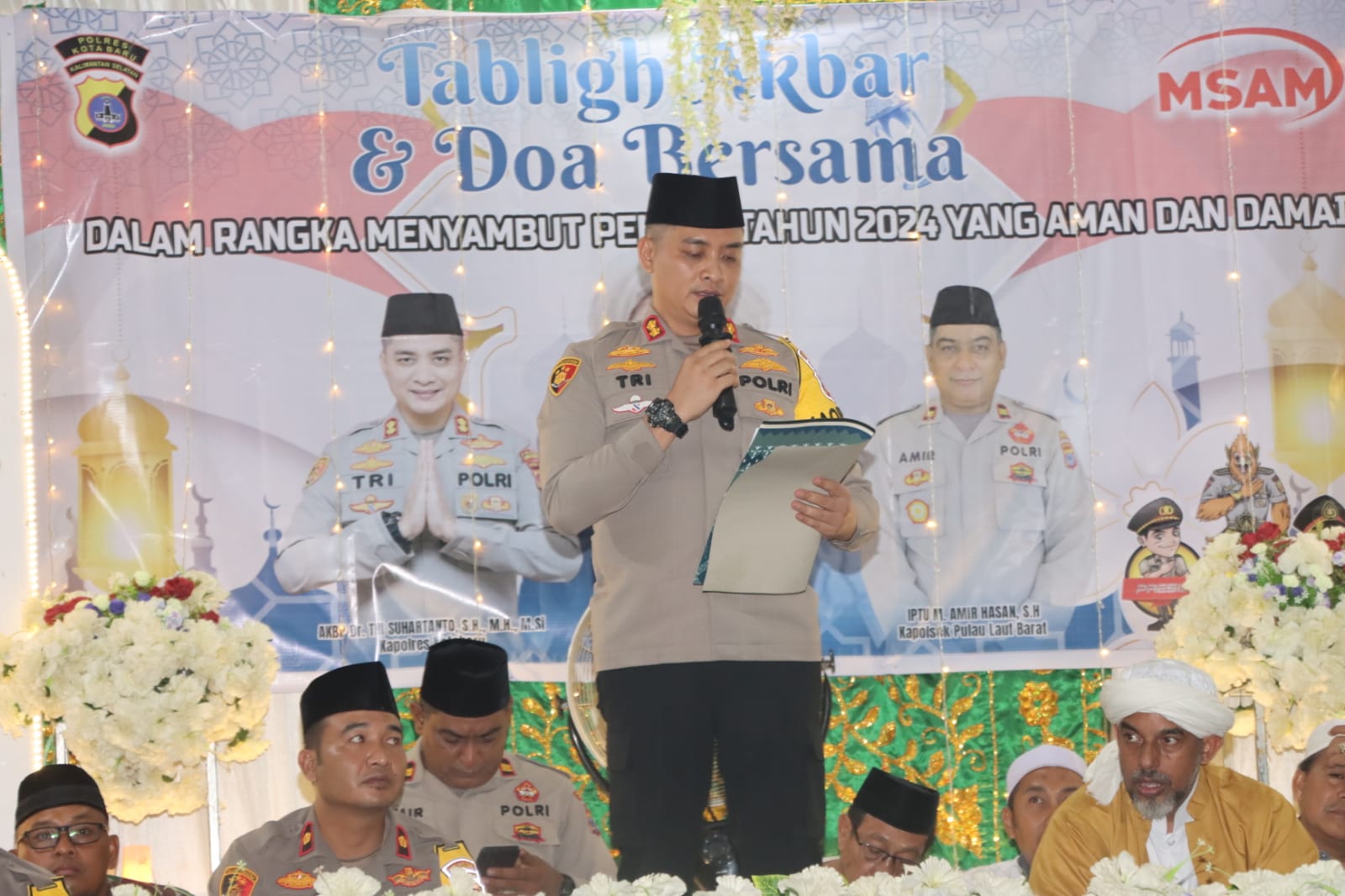 Kapolres Kotabaru AKBP Tri Suhartanto memberikan sambutannya menyampaikan bahwa tabligh akbar dan doa bersama ini menjadi momen penting dalam persiapan Pemilu 2024.