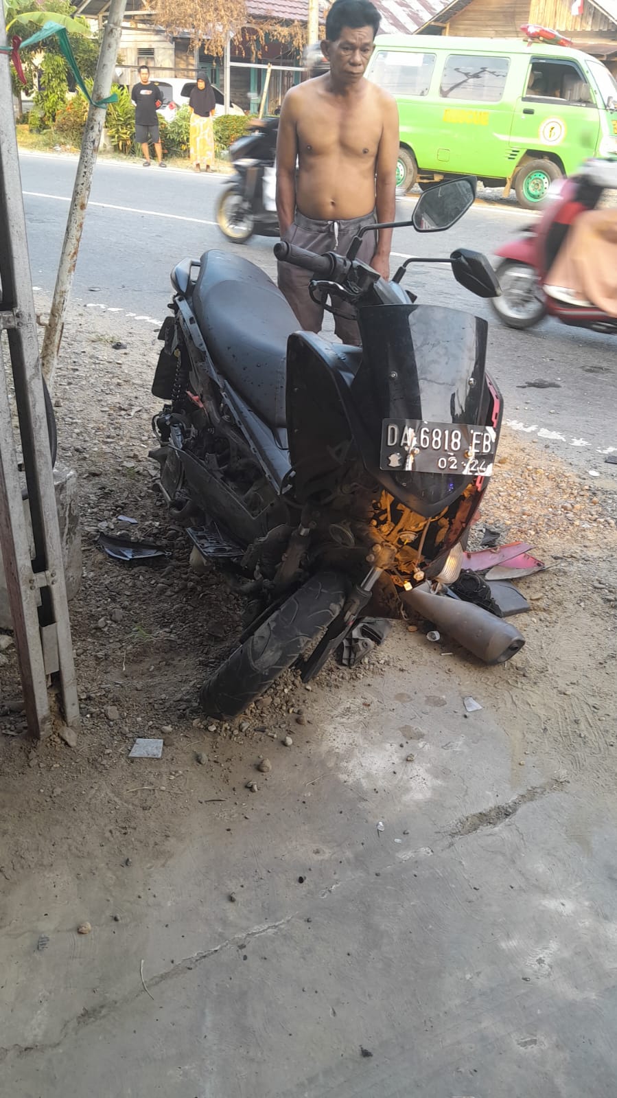 Peristiwa itu melibatkan pengendara sepeda motor vs mobil tepatnya di tikungan Jalan Merdeka Desa Kapar, motor jenis matic menabrak mobil jenis pick-up