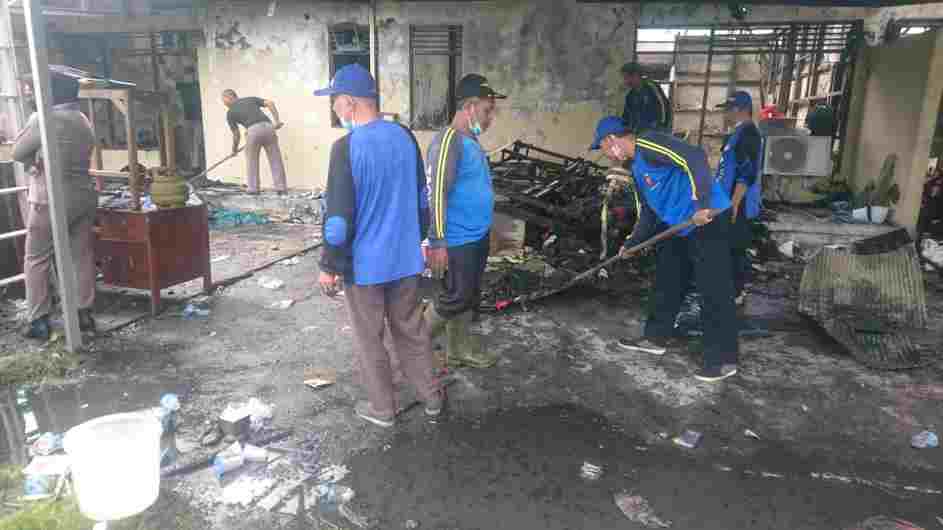 Tagana-Satpol PP-PMK Bantu Bersihkan  Aspol Polsek Utara Pasca Terbakar