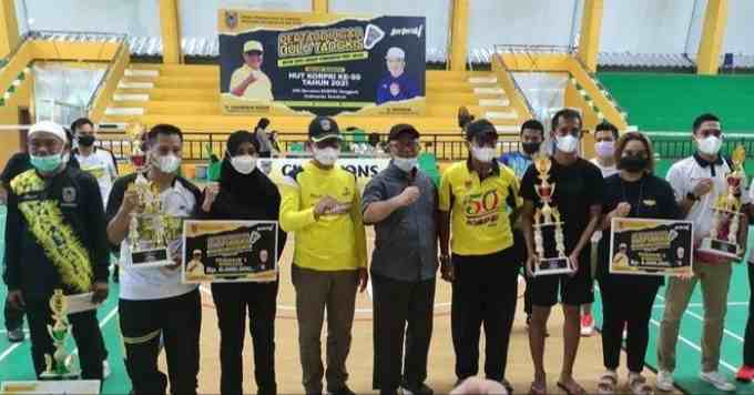 Banjarmasin, BARITO – Ganda Nor Tajudin/Rijali akhirnya menjuarai Kejuaraan Bulu Tangkis Antar SKPD Lingkup Pemprov Kalsel dalam rangkaian HUT KORPRI ke-50. Utusan Dinas Pendidikan Kalsel itu, berhasil mengalahkan Amin/Indra yang merupakan perwakilan Dinas Sosial dalam dua set langsun 21-10 dan 21-12, Sabtu (4/12/2021) di GOR Hasanuddin Banjarmasin.
