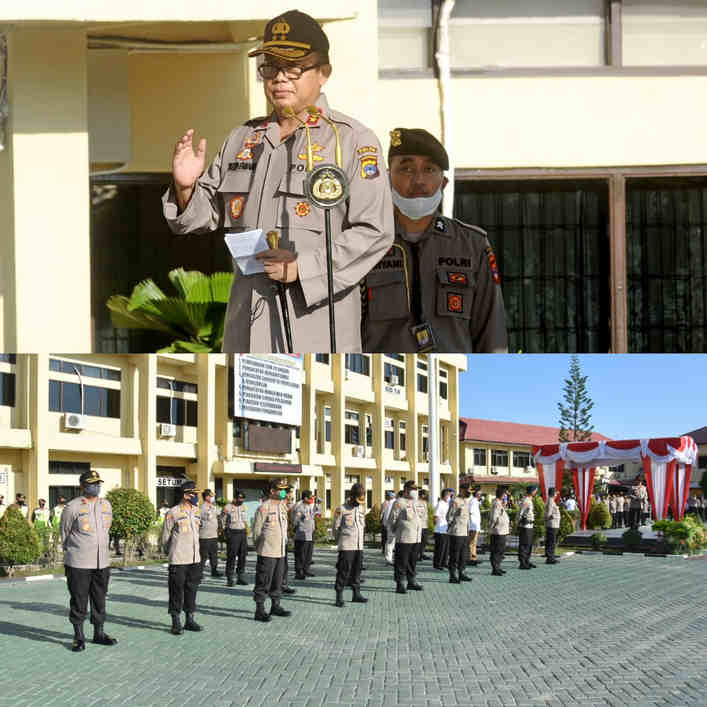 Banjarmasin, BARITO – Tepuk tangan panjang bergema di Lapangan Upacara Mapolda Kalsel mengiringi naiknya Kapolda Kalsel Irjen Pol Yazid Fanani ke podium, Rabu 6/4/2020.