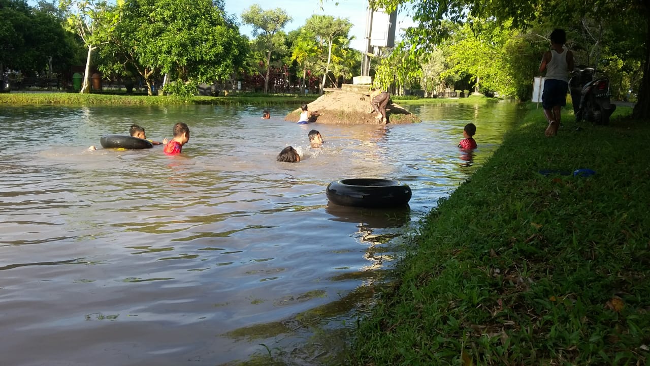Pemantauan wartawan baritopost.co.id, saban hari kerukan tanah di sekitar taman yang dipenuhi air hujan itu, dimanfaatkan anak-anak untuk bermain air dan berenang.