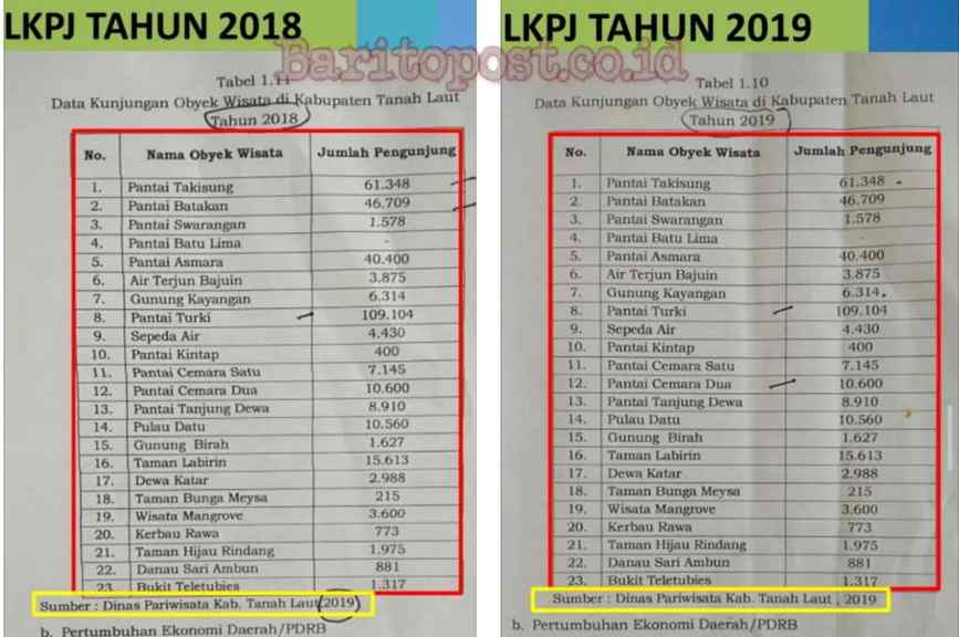 Bukti copy pastenya data antara LKPJ 2018 dan tahun 2019 diambil sampel pada SKPD Dinas Pariwisata khususnya data jumlah kunjungan kesejumlah objek wisata yang ada di Kabupaten Tanah Laut.