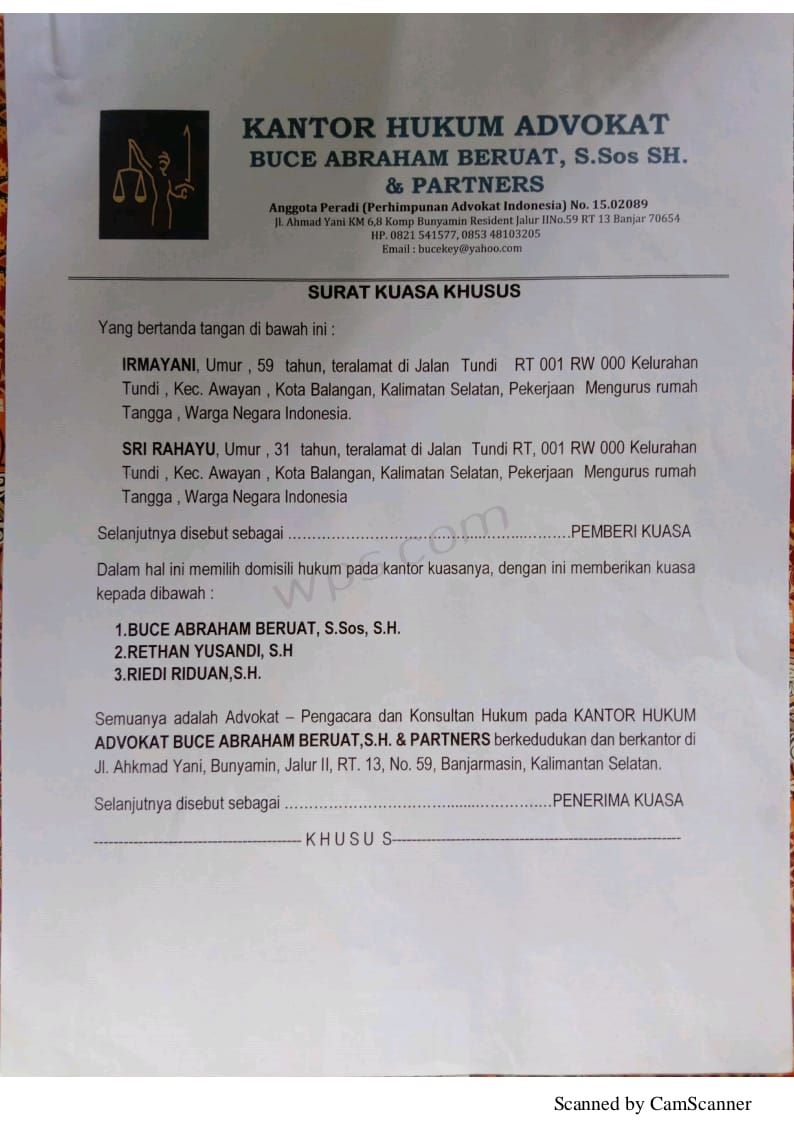 Irmayani dan Sri Rahayu melalui kuasa hukum tim Advokat Buce Abraham Beruat S.Sos SH melayangkan somasi terhadap PT Balangan coal tertanggal 13 Januari 2020 kemarin. Melalui kuasa hukumnya ini mereka menutut penyelesaian dan kejelasan terkait lahan mereka yang digarap tanpa seijin dan jual beli.