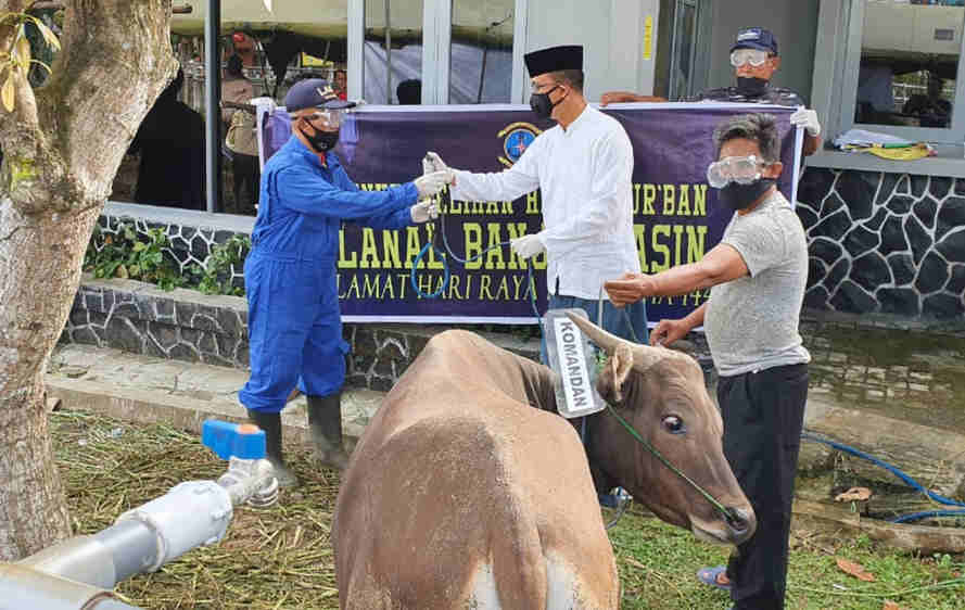 Komandan Lanal Banjarmasin Kolonel Laut (P) Sandharianto memimpin langsung penyembelihan 9 ekor sapi dan 5 ekor kambing, setelah melaksanakan Sholat Idul Adha 1441 H