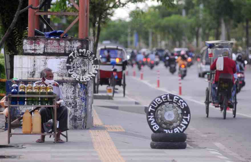 Banjarmasin, BARITO – Kakek Sholeh (62 tahun) selalu memakai masker saat berjualan bensin di kawasan Jalan A Yani, Km 5, Senin (23/11/2020).