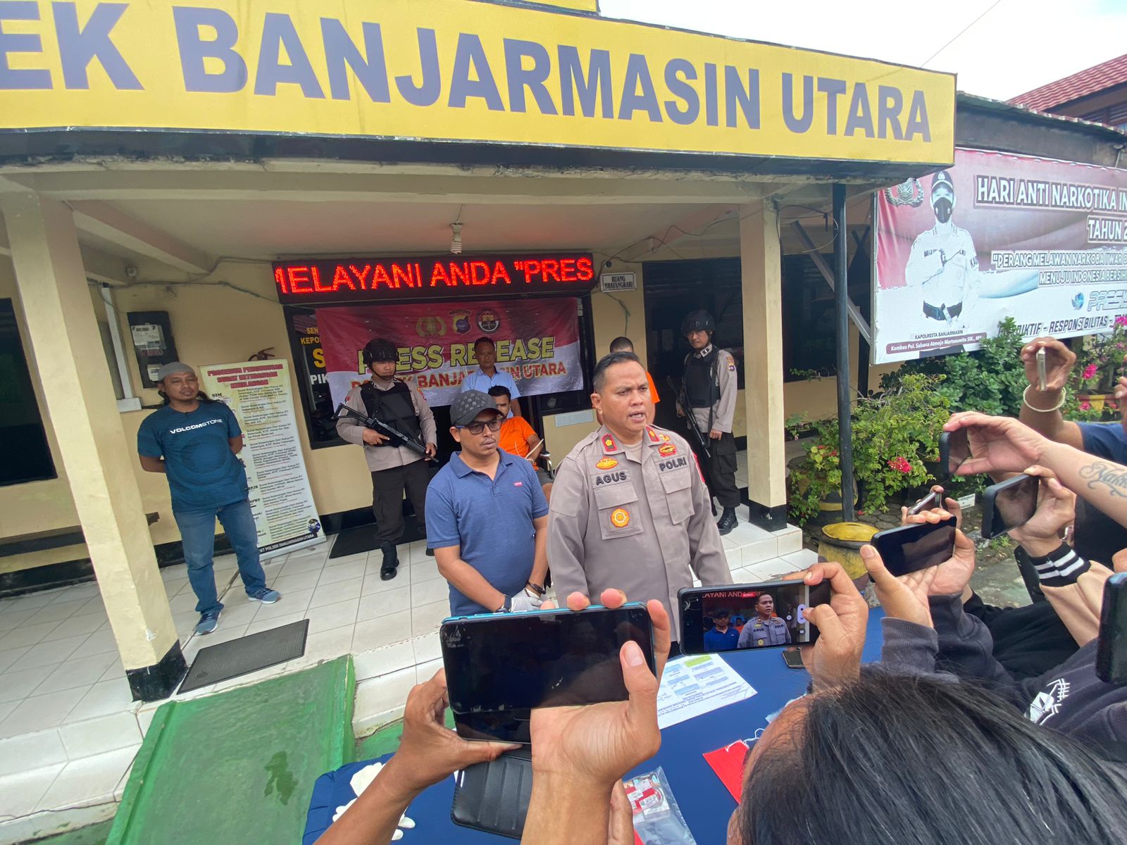 GELAR PEMBUNUHAN - Kapolsek Banjarmasin Utara Kompol Agus Sugianto didampingi Kanit Reskrim Iptu Sudirno saat menggelar kasus pelaku pembunuhan di Komplek Taekwondo Banjarmasin, Jumat (21/7/2023) siang. (foto:sum/brt)