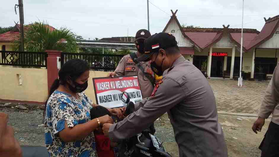 Terpantau dilapangan berberapa anggota Polsek sedang melakukan penegakan protokol kesehatan kepada pengguna jalan yang melintas di depan kantor Polsek.