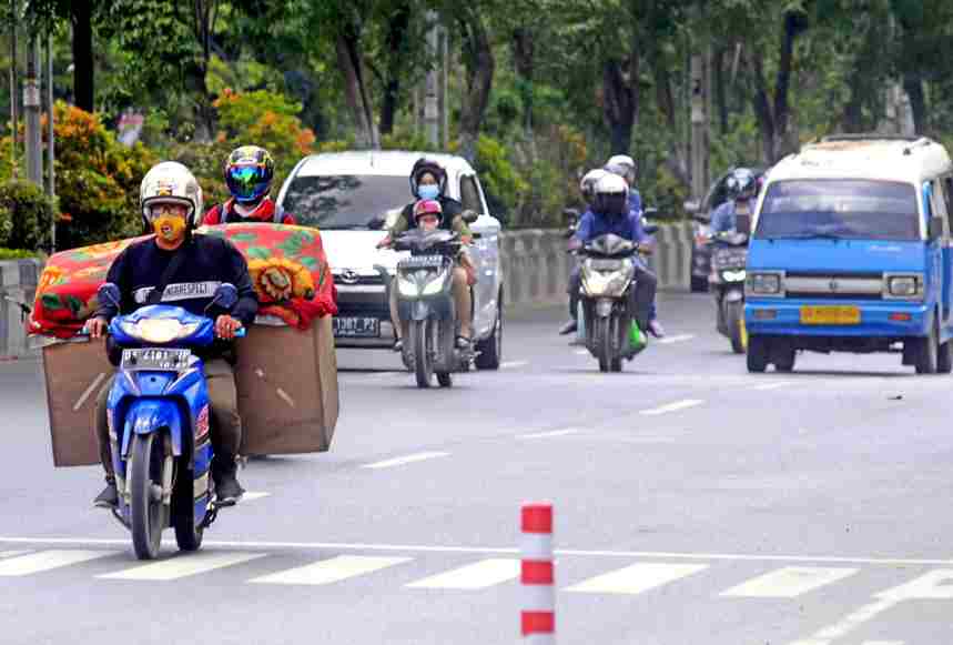 Banjarmasin, BARITO – Himbauan pemerintah kepada masyarakat agar menggunakan masker saat beraktivitas keluar rumah terlihat berhasil, terlihat pengendara yang melintas di Jalan A Yani, KM 3 Banjarmasin Utara, Kota Banjarmasin memakai masker saat berkendara, Senin (28/12/2020)