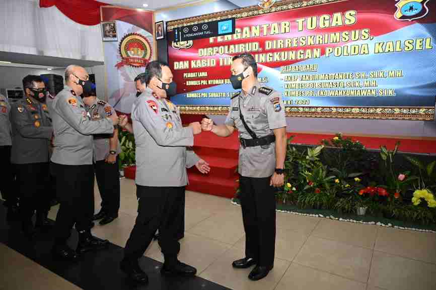 Kapolda meminta kepada para Pejabat baru Direktur Reskrimsus Polda Kalsel Kombes Pol Suhasto, S.I.K., M.H., Kabid TIK Polda Kalsel Kombes Pol Eko Wahyuniawan, S.I.K., dan AKBP Takdir Mattanete, S.H., S.I.K., M.H. selaku Direktur Polairud Polda Kalsel untuk bekerja dengan baik bagi masyarakat.