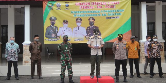 Polres Barito Kuala, Polda Kalsel – Apel Gabungan pemberlakuan pembatasan kegiatan masyarakat (PPKM) Berbasis Mikro digelar di Halaman Pemerintah Kabupaten Barito Kuala (Pemkab Batola), Kamis (18/2/2021) pukul 10.00 Wita.