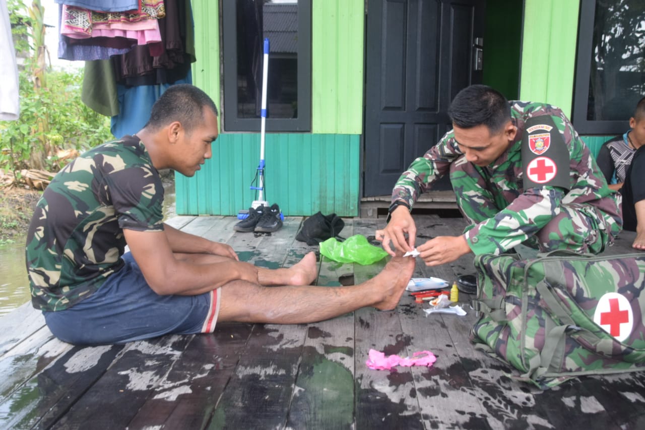 Serda Okie dari tim kesehatan yang juga tergabung dalam Satgas TMMD Kodim 1007/Banjarmasin dengan cepat mengobati luka ringan Prada Akmal. Korban mengalami kecelakaan terpeleset saat mengerjakan jembatan yang merupakan sasaran fisik TMMD tersebut.