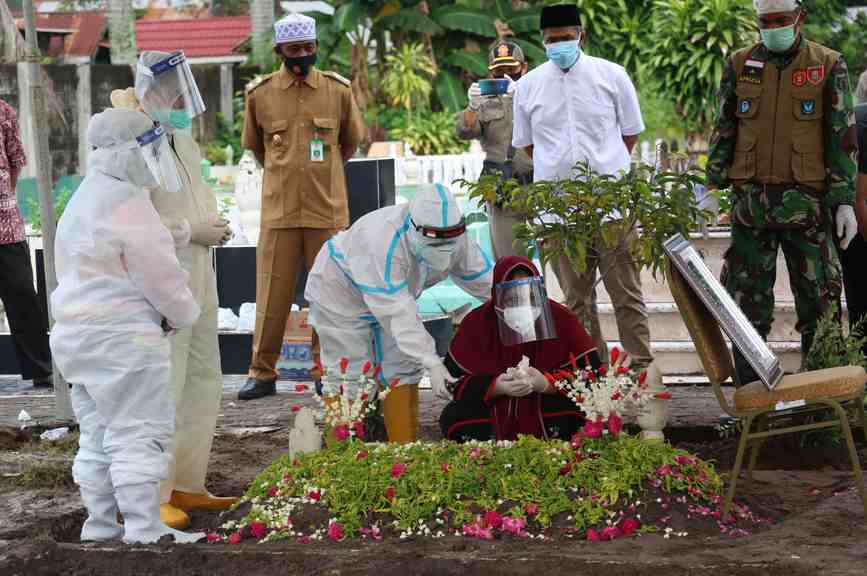 Sementara itu, dari kejauhan terlihat istri almarhum Nadjmi Adhani, Ririn Kartika Rini, yang rela meninggalkan rumah sakit untuk mengantar kepergian suami tercinta ke tempat peristirahatan terakhir. Dia dikawal dua petugas mengenakan alat pelindung diri (APD) lengkap. Sebagaimana diketahui, Ririn juga terinfeksi Covid-19 dan masih dalam perawatan.
