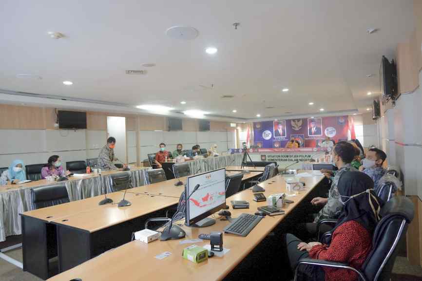 Rombongan Komisi I dipimpin ketuanya Hj Rachmah Norlias didampingi Wakil Ketua DPRD Kalsel Hj Karmila dan mitra kerjanya Badan Kesatuan Bangsa Dan Politik (Kesbangpol) Kalsel diterima Direktur Ketahanan Ekonomi, Sosial dan Budaya Ditjen Polpum Kemendagri RI La Ode Ahmad, MmSi beserta jajarannya di ruang rapat Situation Room, Jumat (4/6/2021).