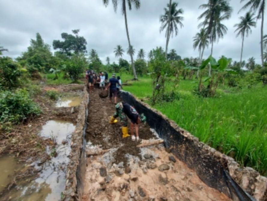 Bersama dengan warga, para anggota Satgas TMMD tidak pernah mengenal hari libur mengerjakan sasaran fisik di Sungai Gampa.
