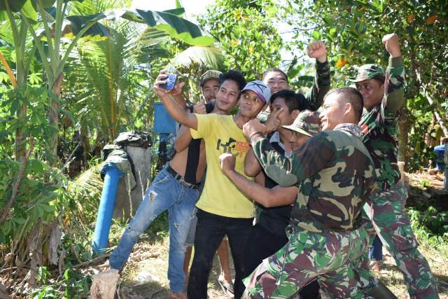 SELFI DULU-Di sela-sela istirahat, anggota TNI dan warga Kuin Kecil Kelurahan Mantuil Banjarmasin Selatan mengabadikan kerja buat siring jalan, mereka dengan Selfi atau foto pakai ponsel dilakukan sendiri, Jumat (5/7/2019) pagi. (foto:ist)