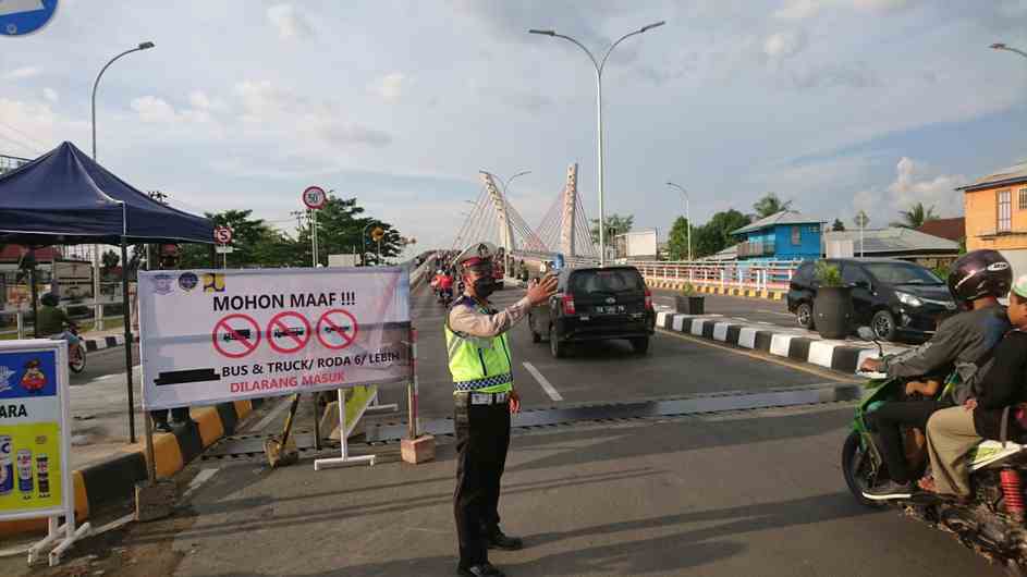 JAGA TRUK-Salah satu anggota Polisi lalu lintas Polresta Banjarmasin saat menjaga truk agar tidak lewat jembatan Alalak, Senin (27/9/2021).(foto/sum/brt)